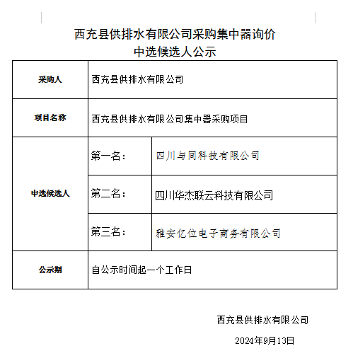 西充縣供排水有限公司采購(gòu)集中器詢價(jià)中選候選人公示