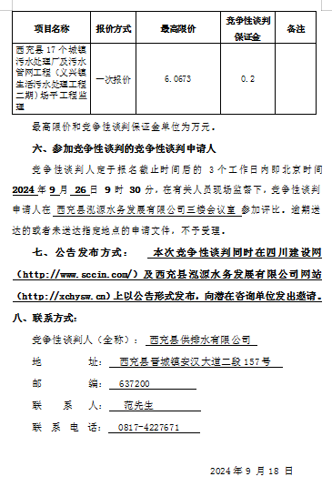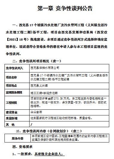西充縣17個城鎮(zhèn)污水處理廠及污水管網(wǎng)工程(義興鎮(zhèn)生活污水處理工程二期)場平工程監(jiān)理競爭性談判邀請