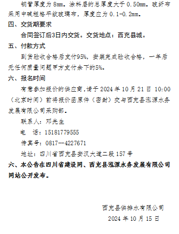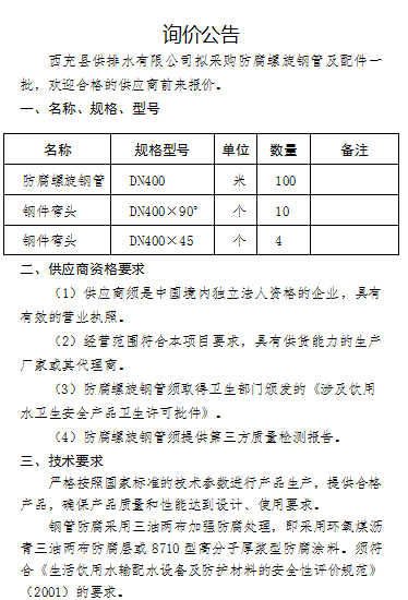 西充縣供排水有限公司擬采購(gòu)防腐螺旋鋼管 詢價(jià)公告