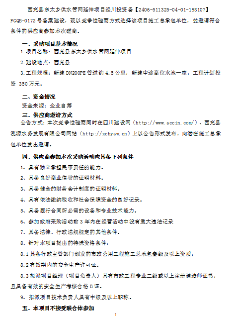 西充縣東太鄉(xiāng)供水管網(wǎng)延伸項目磋商公告